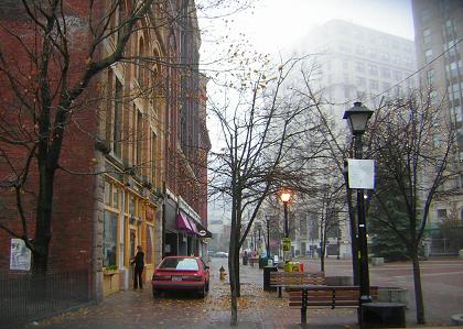 Located on a peninsula and lacking either the population or capital for very much postwar sprawl, the development of one freeway and a mall only temporarily slowed the city’s downtown economy, which has made a dramatic recovery since the 1980s. Dozens of brick warehouses have been converted into offices, lofts, shops, restaurants, and bars. In the last year a new hotel opened adjacent the city’s ferry terminal, and in the 1990s the city opened a public market, attracted a minor league baseball team, and even finally got around to re-establishing passenger rail service. The city government website has more facts and links here.